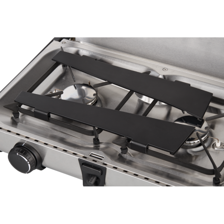 Основой плиты являются две мощные газовые конфорки, которые обеспечивают стабильный приток тепла даже при ветре. Они позволяют легко готовить два блюда параллельно, а благодаря специальной решетке-грилю вы можете использовать вторую зону как полноценный гриль для мяса, овощей или рыбы. Именно этот гриль-надстройка и является главным отличием модели 2Z GP — классическая RYDA 2Z не имеет гриль-компонента и работает только как стандартная плитка. Здесь же вы получаете дополнительный функционал, который значительно расширяет возможности приготовления.