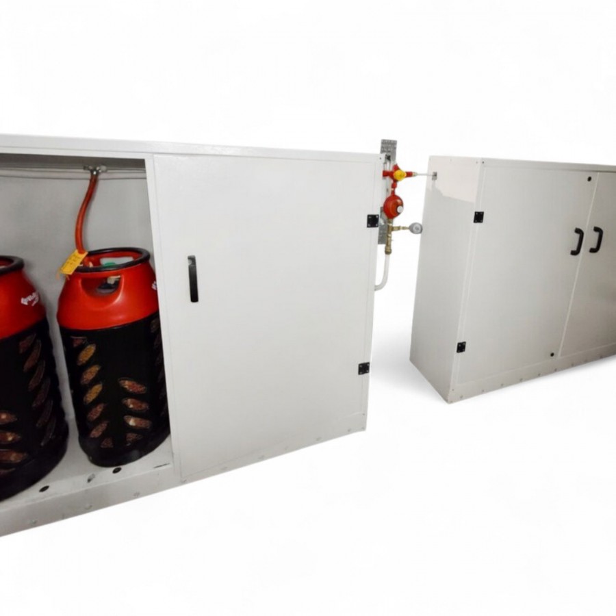 Система устанавливается снаружи здания или в специально оборудованном месте с вентиляцией согласно нормам безопасности. Баллоны размещаются в металлических шкафах, которые: